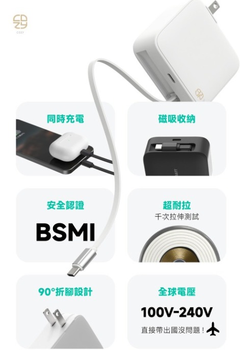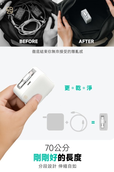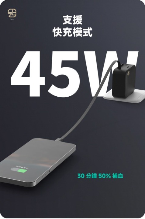COZY GAN14-45W 45W自動伸縮線快充頭 Type-C伸縮充電器,線長70cm一秒收線 厚度更薄僅3.1cm,不占用其他充電孔位 氮化鎵 GaN 台製新型半導體晶片,提速低溫不燙手。 第三代新型半導體材料,航天黑科技材料,化學穩定性佳 。 輕巧,方便攜帶,重量85g。 革新PPS快充協議,搭配PD3.0快充,兼容QC3.0快充功能,可供各類手機、平板、筆電、switch、藍牙耳機、手環等智能設備。 黑白兩色可選