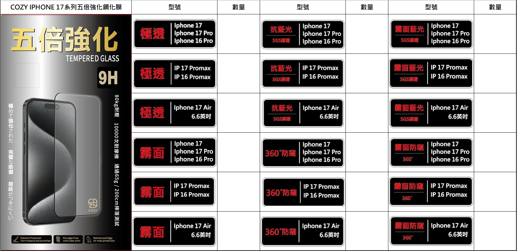 COZY IPHONE 17系列五倍強化鋼化膜 9H硬度可以有效保護手機螢幕畫痕和外部衝擊 五倍強化鋼化膜比一般鋼化膜更有效保護使用者手機螢幕 奈米電鍍工藝 抗指紋疏油疏水 高透光率 超清畫質 超光滑表面觸感 手機像原始螢幕觸感 80kg耐壓 10000次耐磨擦 通過65g/200cm摔落測試