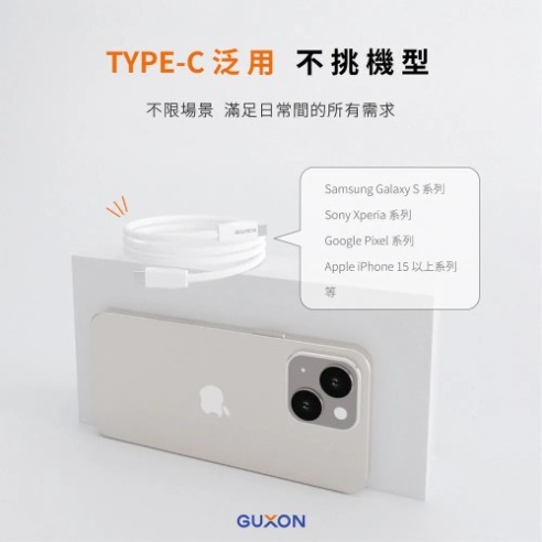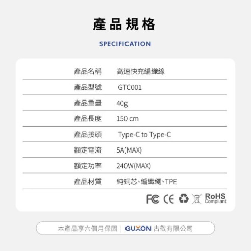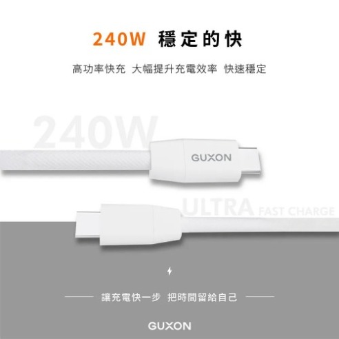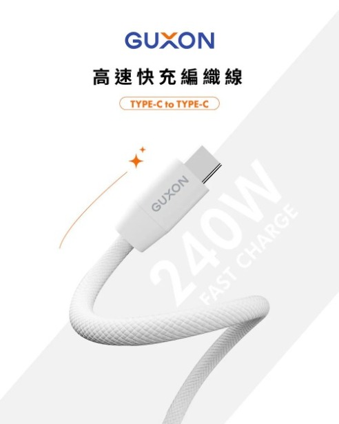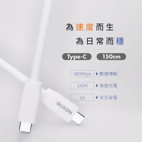 GUXON240W 高速快充編織線 Type-c to Type-c PD 3.1 快充協議|支援最高 240W 輸出,筆電也能閃電快充 耐用編織線材|尼龍+TPE 材質,抗拉不纏繞、不易斷裂 480Mbps 數據傳輸|充電+傳輸同步進行,資料備份不卡頓 純銅線芯設計|導電穩定、長時間使用不易發熱 TYPE-C 全面相容|支援 iPhone 15 / Samsung / Pixel / Switch 等設備 實用 150CM長度|辦公、床邊、旅行充電都順手 黑白兩色可選